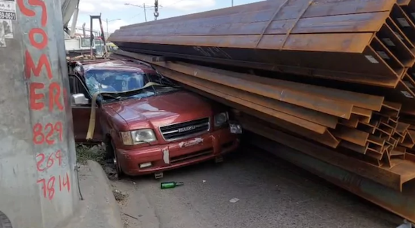 A man parked to the right side of Duarte Highway to let out a friend. He suddenly found himself under falling beams of steel and saved his life because the passenger seat door was still open when the cargo of the truck collapsed on him as reported in Diario Libre.