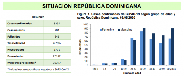 According to Coronavirus Bulletin #46 of the Public Health Ministry’s Department of Epidemiology, the Dominican Republic has 8,235 confirmed cases, 281 new confirmed cases and 346 deaths. There are 1,507 patients hospitalized, including 132 in intensive care units.