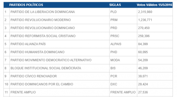In the 2016 general election, the Dominican Liberation Party (PLD) received 2,315,980 votes, for first place. The Modern Revolutionary Party (PRM) received 1,236,771, for second place. The Dominican Revolutionary Party (PRD) was third, with 270,450 votes; and the Social Christian Reformist Party (PRSC) was fourth, with 259,396 votes.