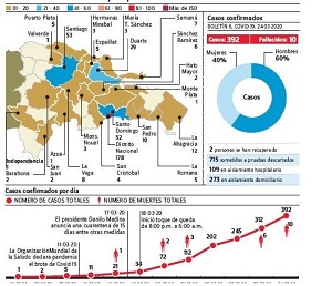 The Ministry of Public Health reported on Wednesday, 25 March that the total of cases had increased from 312 on Tuesday to 392 on Wednesday. There have been 10 deaths. So far, the Greater Santo Domingo has the most cases with a combined 230 (178 in National District + 52 in Santo Domingo province), followed by Santiago with 53 cases and Duarte province with 29 cases.