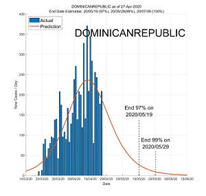 It forecasts for the Dominican Republic that 97% of the disease will have ended for 19 May 2020 and 99% by 29 May 2020. By 9 July 2020 the disease will have died out by 100%, according to the forecast.