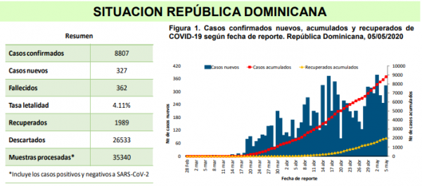 According to Coronavirus Bulletin #48 of the Public Health Ministry’s Department of Epidemiology, the Dominican Republic has 8,807 confirmed cases, 327 new confirmed cases and 362 deaths. There are 1,598 patients hospitalized, including 134 in intensive care units.