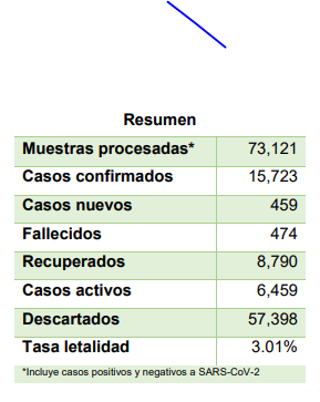 According to Coronavirus Bulletin #69 of the Ministry of Public Health’s Department of Epidemiology, the Dominican Republic has 15,723 confirmed cases, 459 new confirmed cases and 474 deaths, including six new deaths. 2,231 patients are hospitalized, 112 in intensive care units. The total includes 116 in intensive care units. The results are from 73,121 PCR diagnostic tests.