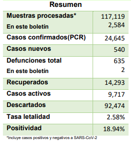 According to Coronavirus Bulletin #91 of the Ministry of Public Health’s Department of Epidemiology, the Dominican Republic has 24,645 confirmed cases, 540 new confirmed cases from 117,119 PCR diagnostic tests. The tally of deaths is 635, including 2 new registered deaths.