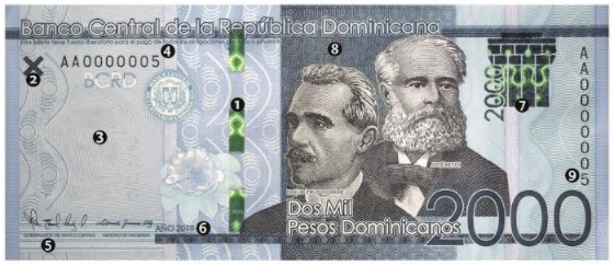 The Central Bank of the Dominican Republic (BCRD) announced the circulation of a RD$2,000 bill that incorporates new security measures. As reported, the security thread changes in color from green to blue with a drop effect of undulating sand. The year of the printing is at the bottom of the front of the banknote to facilitate the series’s identification. The image of founding father Juan Pablo Duarte is watermarked onto the bill.