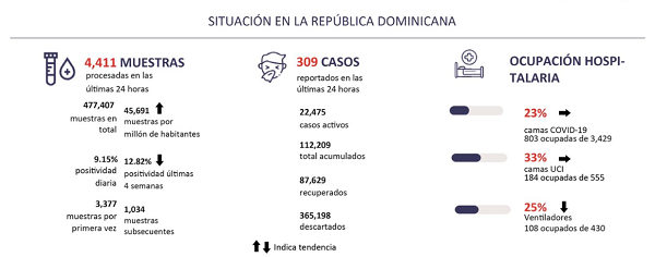 As of 29 September at 6pm, the deadline for Bulletin #195, the most confirmed cases were persons resident in National District (30,550) and the Santo Domingo province (23,088) 48% of the 112,209 confirmed cases nationwide.