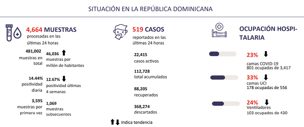 Still, the Ministry of Public Health reports 22,415 active cases, down 60 cases compared to the previous day. Yet for the first time in more than a week, the number of confirmed PCR cases has gone over the 500 case mark. There was a spike in cases in Espaillat (Moca) with 90 new cases, and the National District with 75 cases. This also can be attributed to an increase in contact tracing efforts as the health authorities strive to catch cases early on.