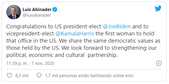 President Luis Abinader sent a tweet to President-elect Joe Biden in the United States on 7 November 2020 after the election was called in the United States. “Congratulations to US president-elect @JoeBiden and to vice-president-elect @KalamaHarris, the first woman to hold that office in the US. We share the same democratic values as those held by the US. We look forward to strengthening our political, economic and cultural partnership,” wrote President Abinader in his note to Biden.