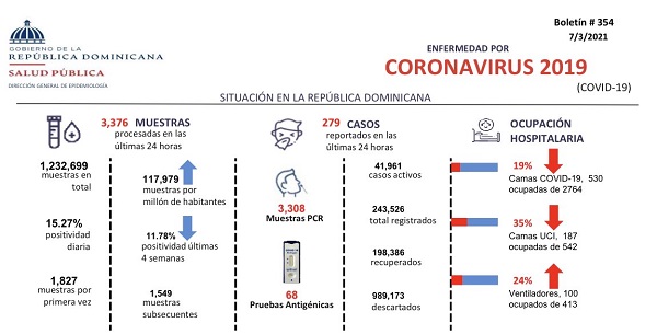 The Ministry of Public Health report #354 indicates 19% of Covid-19 hospital beds are occupied (530 of 2,764 total available), down from the previous day. 35% of the intensive care units for Covid-19 are taken (187 of 542 beds), up from the previous day. The hospitalization statistics are for all the country. Hospitalization demand in Greater Santo Domingo, Santiago and other major cities is much higher than the national average.