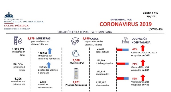 The Ministry of Public Health’s Epidemiology Department Coronavirus Bulletin #440 reports 1,659 new PCR cases for the Tuesday, 1 June 2021 deadline. There is a spike of Covid-19 cases attributed to the entry of the more transmissible Brazilian and UK variants of the disease and the increased mobility. As has been happening since the start of the pandemic, Greater Santo Domingo concentrates the most new cases. The cases compare to the 7-day nationwide average for PCR confirmed cases that is 1,344, up from the previous day.