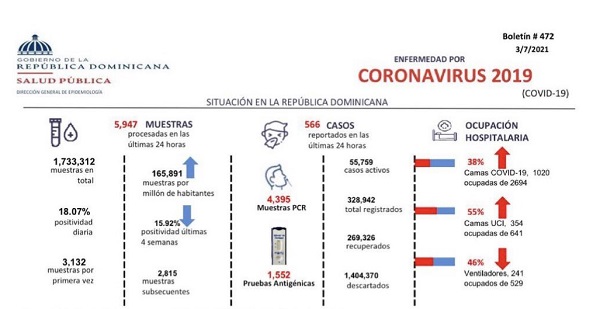 The Ministry of Public Health report #472 indicates 38% of Covid-19 hospital beds are occupied (1,020 of 2,694 total available), down compared to the previous day. Reports are that around 55% of Covid-19 beds in Greater Santo Domingo are occupied, not so in the rest of the country. 55% of the intensive care units for Covid-19 are taken (354 of 641 beds), up from the day before. These numbers still reflect the spike in cases that began in early May with the reduction in circulation restrictions and the arrival of the more aggressive virus variants. The hospitalization statistics are for all the country. Hospitalization demand in Greater Santo Domingo, Santiago and other major cities is much higher than the national average.