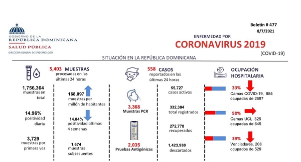 The Ministry of Public Health report #477 indicates 33% of Covid-19 hospital beds are occupied (884 of 2,687 total available), down compared to the previous day. 50% of the intensive care units for Covid-19 are taken (325 of 645 beds), down from the day before. The hospitalization statistics are for all the country. Hospitalization demand in Greater Santo Domingo, Santiago and other major cities is much higher than the national average.