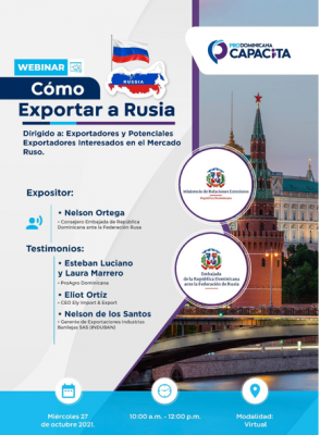 Pro Dominicana, the government export and investment agency, and the Dominican Embassy in Russia have organized a webinar to teach Dominicans how to export to Russia. The presentation is by Nelson Ortega, a counsellor at the Dominican Embassy in Russia. Also speaking will be successful exporters, Esteban Luciano and Laura Marrero for ProAgro Dominicana, Eliot Ortiz for Ely Import & Export and Nelson de los Santos, for Induban.