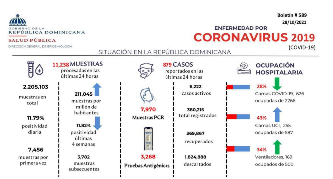 The Ministry of Public Health report #589 indicates 28% of Covid-19 hospital beds are occupied (626 of 2,604 total available), down from the previous day. 43% of the intensive care units for Covid-19 are taken (255 of 587), up from the day before. The hospitalization statistics are for all the country. Hospitalization demand in Greater Santo Domingo, Santiago and other major cities is much higher than the national average.