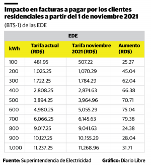 A report in Diario Libre says this translates in tariff increase of RD$25.27 to RD$79.38 per customer, depending on consumption.