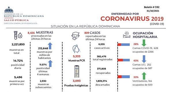 Three Covid-related deaths is recorded for the 31 October 2021 deadline. One death is reported having occurred in the previous 24 hours of the deadline. As of the 31 October 2021 deadline, 4,133 persons are reported to have died of the disease in the Dominican Republic, a nation of more than 10.8 million adults since March 2020. The fatality rate has been dropping and now is at 1.08%. The fatality rate per 1M inhabitants is 395.56. Dominican physicians’ diverse treatment for the disease has been relatively successful in the region. The Ministry of Public Health reports that the country’s 395.56 fatality rate per 1M compares favorably to the average 1M inhabitants’ fatality rate for the Americas at 2,206.11 as of 31 October 2021.