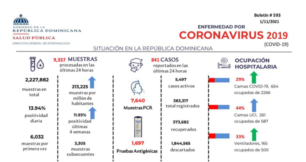 The Ministry of Public Health report #593 indicates 29% of Covid-19 hospital beds are occupied (654 of 2,266 total available), up from the previous day. 44% of the intensive care units for Covid-19 are taken (261 of 587), up from the day before. The hospitalization statistics are for all the country. Hospitalization demand in Greater Santo Domingo, Santiago and other major cities is much higher than the national average.