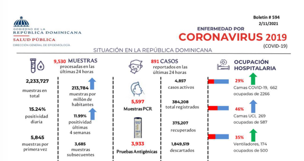 The Ministry of Public Health report #594 indicates 29% of Covid-19 hospital beds are occupied (662 of 2,266 total available), up from the previous day. 46% of the intensive care units for Covid-19 are taken (269 of 587), up from the day before. The hospitalization statistics are for all the country. Hospitalization demand in Greater Santo Domingo, Santiago and other major cities is much higher than the national average. The hospitals say that most of the patients that require hospitalization had not been vaccinated for Covid-19.