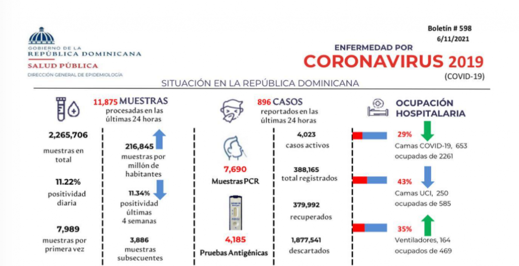 The Ministry of Public Health report #598 indicates 29% of Covid-19 hospital beds are occupied (653 of 2,261 total available), down from the previous day. 43% of the intensive care units for Covid-19 are taken (250 of 585), down from the day before. The hospitalization statistics are for all the country. Hospitalization demand in Greater Santo Domingo, Santiago and other major cities is much higher than the national average. The hospitals say that most of the patients that require hospitalization had not been vaccinated for Covid-19.