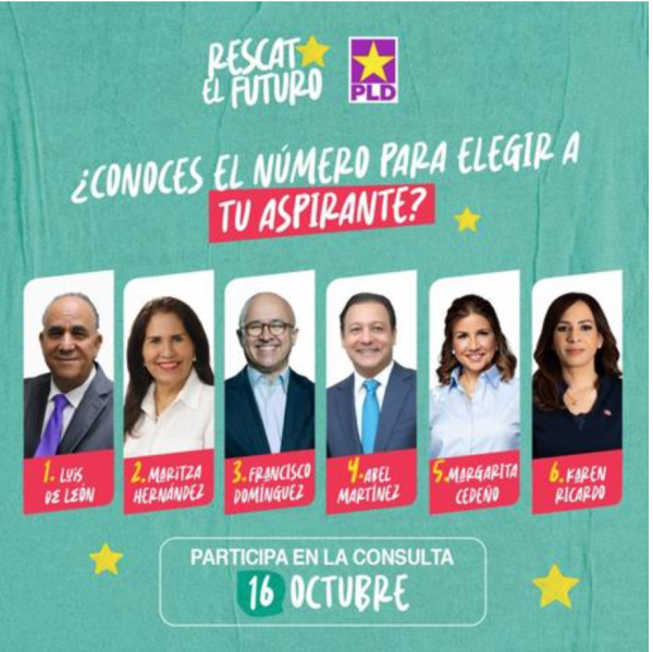 The Central Committee of the PLD recognizes six pre-candidates. These are: former Vice President and First Lady Margarita Cedeño, Former president of the Chamber of Deputies and Mayor of Santiago Abel Martínez, former Attorney General and Minister of Environment Francisco Domínguez Brito. Also the lesser known, former PLD deputy Karen Ricardo and former Minister of Labor Maritza Hernández and Luis de León, president of the Fuerza Boschita political movement.
