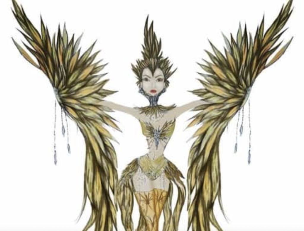 The costume is a call to take care of biodiversity and birds in danger of extinction. The costume features golden feathers made from recycled material.