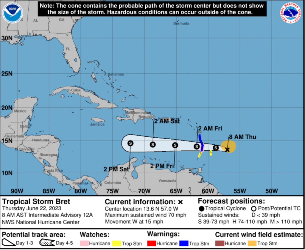 The US National Hurricane Center forecasts Tropical Storm Bret will approach the Lesser Antilles through Thursday and then move across those islands late Thursday as a strong tropical storm. There is a Tropical Storm Warning in effect for St. Lucia, Martinique and Dominica, with the risk of flooding from heavy rainfall, strong winds and dangerous waves along the coasts. A Tropical Storm Watch remains in effect for Barbados and St. Vincent and the Grenadines.