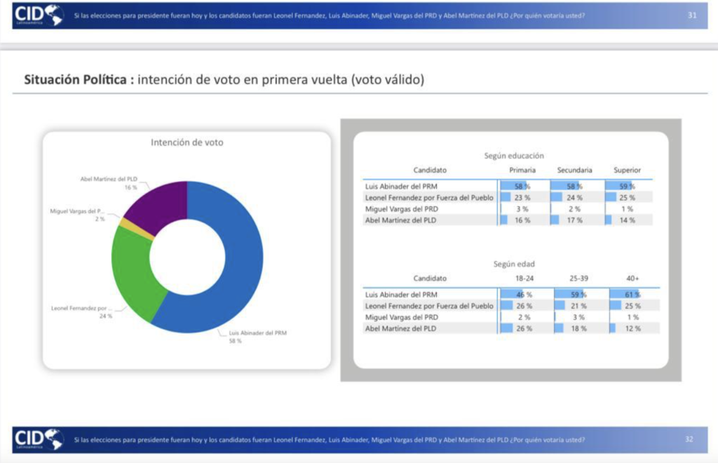 In the summary of the poll, CID Latinoamerica says that Luis Abinader is in an extremely favorable position for the upcoming elections, maintaining a solid support base and winning comfortably in all possible electoral scenarios.