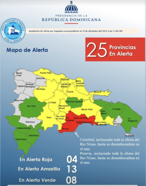 Yellow alerts were issued for María Trinidad Sánchez, Puerto Plata, Espaillat, Hermanas Mirabal, San José de Ocoa. San Pedro de Macorís, Santiago, Azua, Duarte, Samaná, Monseñor Nouel, Monte Plata and La Vega.