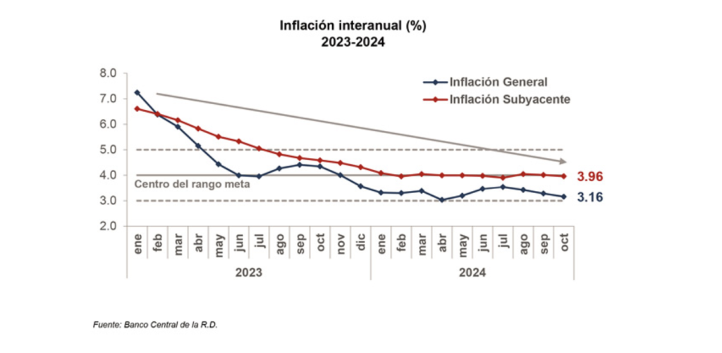 The Central Bank of the Dominican Republic (BCRD) reported that the country’s annual inflation rate decreased to 3.16% in October 2024, down from 3.29% in September. This latest figure marks 11 consecutive months within the Central Bank’s target range of 4.0% ± 1.0%.