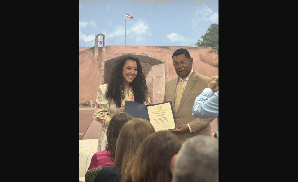 Eyvana Bengochea, senior advisor in the office of Congresswoman María Elvira Salazar, presented Pedro J. Díaz Ballester, president of the Dominican International Chamber of Business and Tourism, with a special congressional recognition certificate for his 45 years of promoting trade, business, tourism, investment, and development relations between the United States and the Dominican Republic.